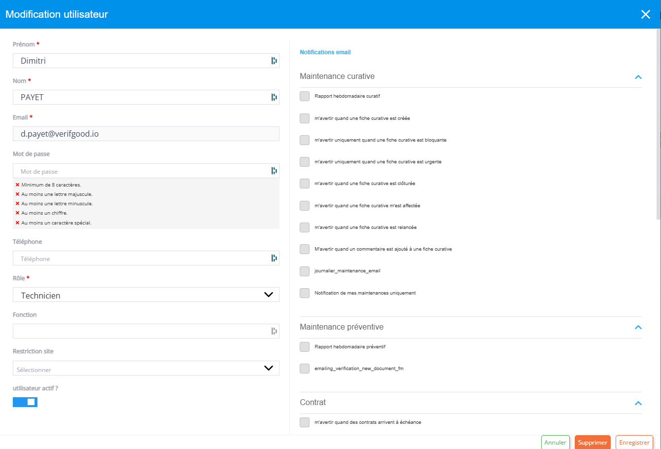 Notifications email (choisir les notifications que l’utilisateur reçoit)