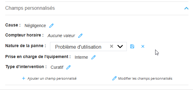 | Cause | Liste déroulante | Non | Oui | Électrique; Mécanique; Hydraulique; Usure; Utilisation | Catégorie racine de la panne |