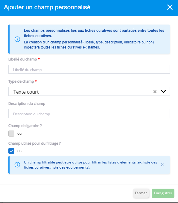 Ouvrir une fiche curative → panneau gauche Champs personnalisés → Ajouter un champ personnalisé.