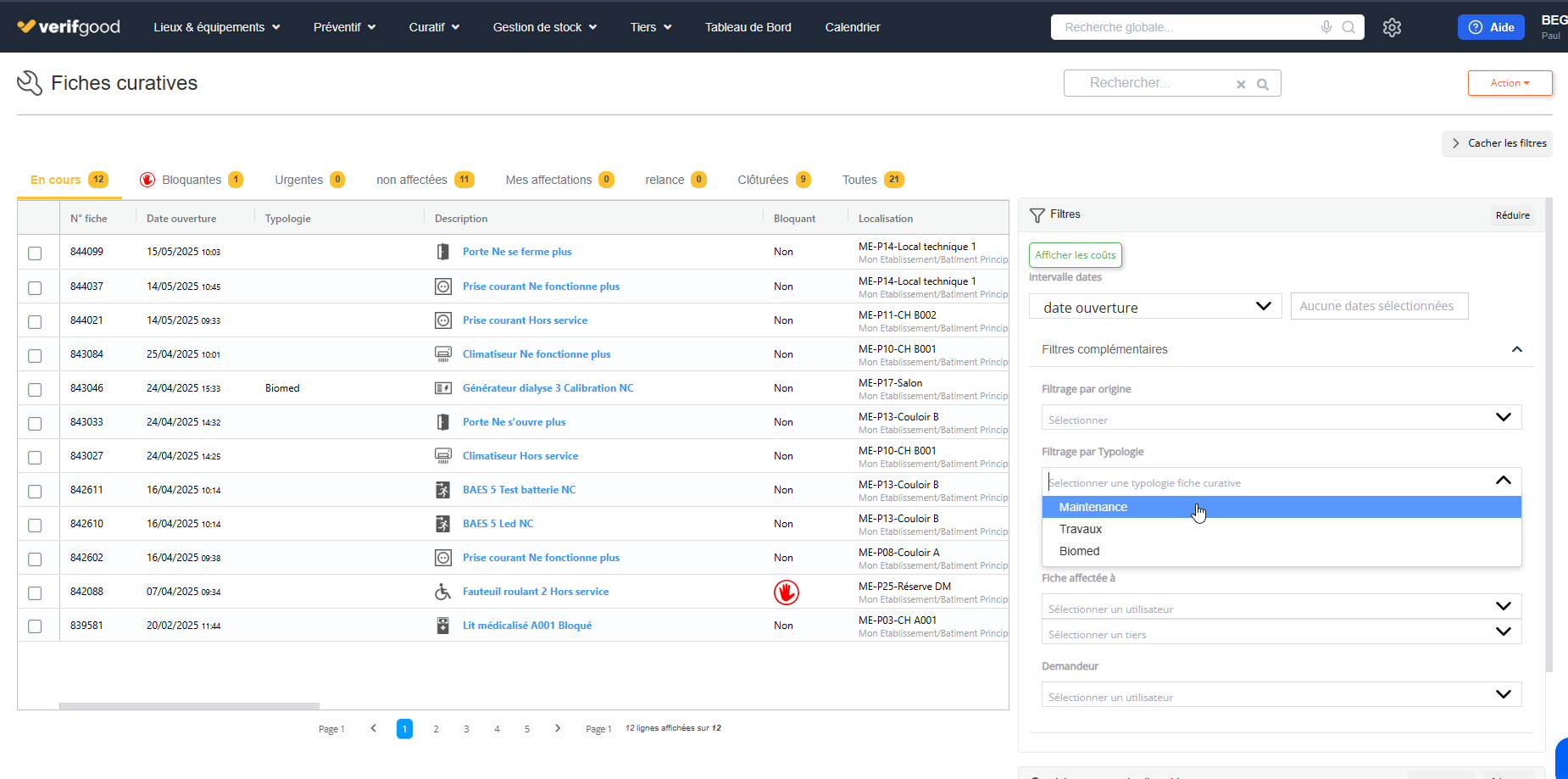 Grâce au système de filtres avancés sur la page Fiches curatives, il est très simple de retrouver toutes les fiches de type "Travaux" :