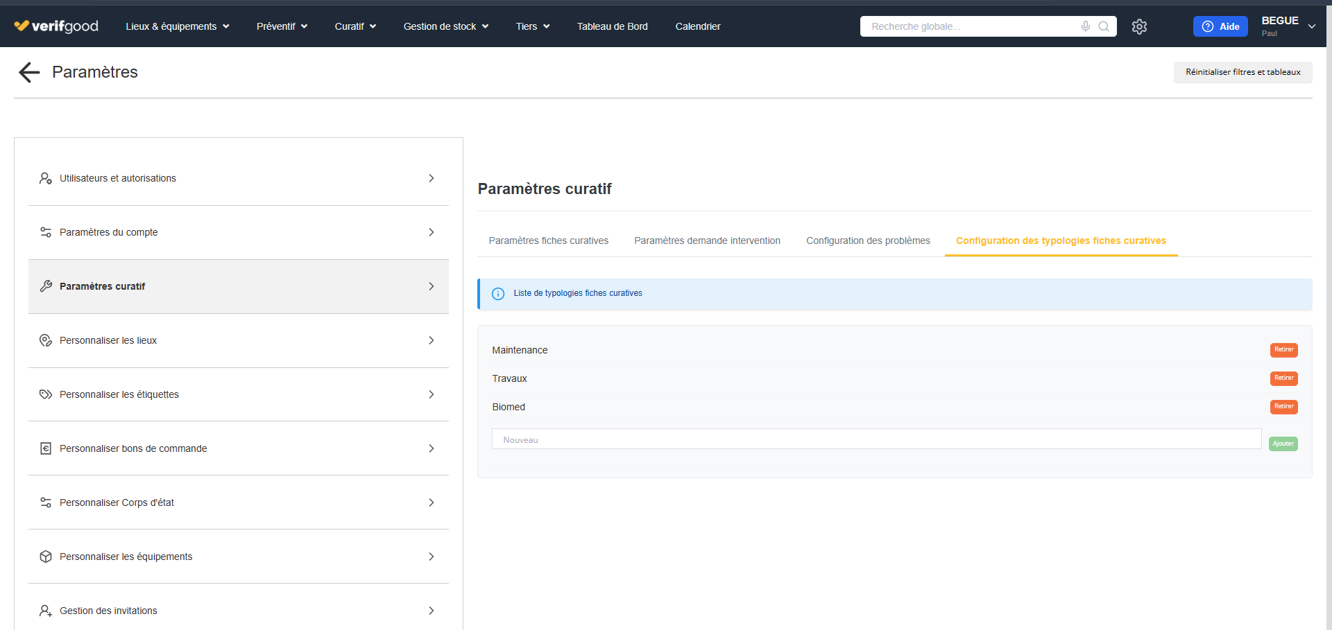 Accédez à l’onglet Configuration des typologies fiches curatives.