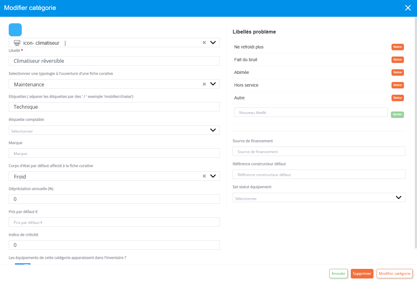 Exemple (voir capture « Modifier catégorie ») : la catégorie Armoire réfrigérée est rattachée au corps d’état Électricité ; toute panne concernant une armoire réfrigérée sera donc pré‑classée en Électricité.
